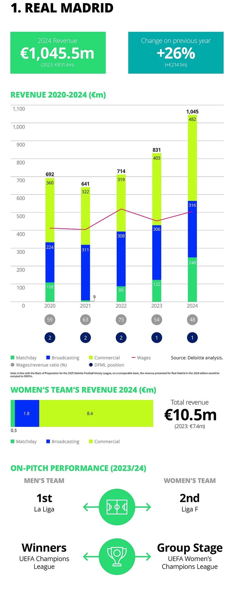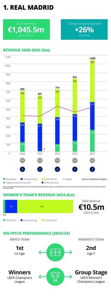 Real Madrid became the first football club to generate over €1 billion in revenue during the 2023/24 season and are at the top of the 2025 Money League. The completion of renovations works to the Bernabéu Stadium catalyzed the growth of matchday revenues to €248m in 2023/24, a 103% uplift on the previous year. The increase was realized predominantly on account of the marketing of Personal Seat Licenses, which provided an uplift of c.€76m, as well as the sale of new VIP seats and the increased capacity of the stadium from December 2023. The club also reported a 20% increase in commercial revenue (from €403m to €482m), boosted by increased merchandise and new sleeve sponsorship.